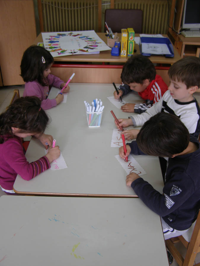 Μια από τις δικές μας ομάδες ετοιμάζει τις πινακίδες με τα ονόματα των φυτών, που θα φυτέψουμε.