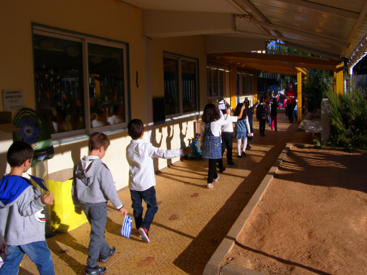 και κάνουμε παρέλαση με τις σημαιούλες μας στην αυλή του Νηπιαγωγείου