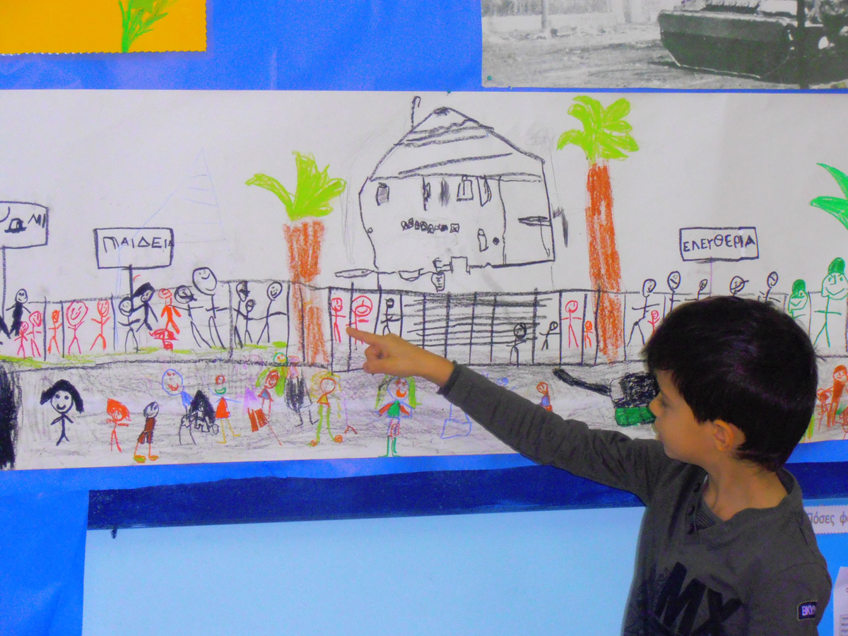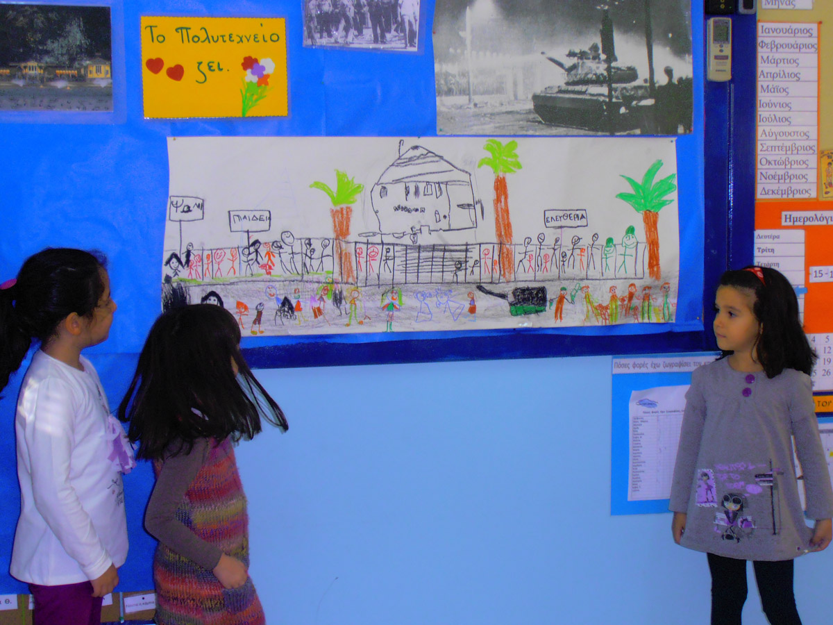 Σε μια ομάδα με κηρομπογιές πάνω σε χαρτί του μέτρου ζωγραφίζουμε το χώρο του Πολυτεχνείου,