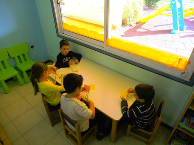 Κι εμείς στο ολοήμερο τμήμα εκτός από όλα τ' άλλα καταπιανόμαστε με ψαλίδια και χαρτιά για να στολίσουμε φθινοπωρινά τα τζάμια μας