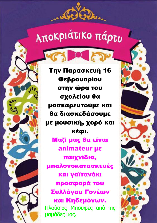 Την Παρασκευή την ημέρα του πάρτι ο σύλλογος γονέων μας διασκεδάζει με παιχνίδια αποκριάτικα