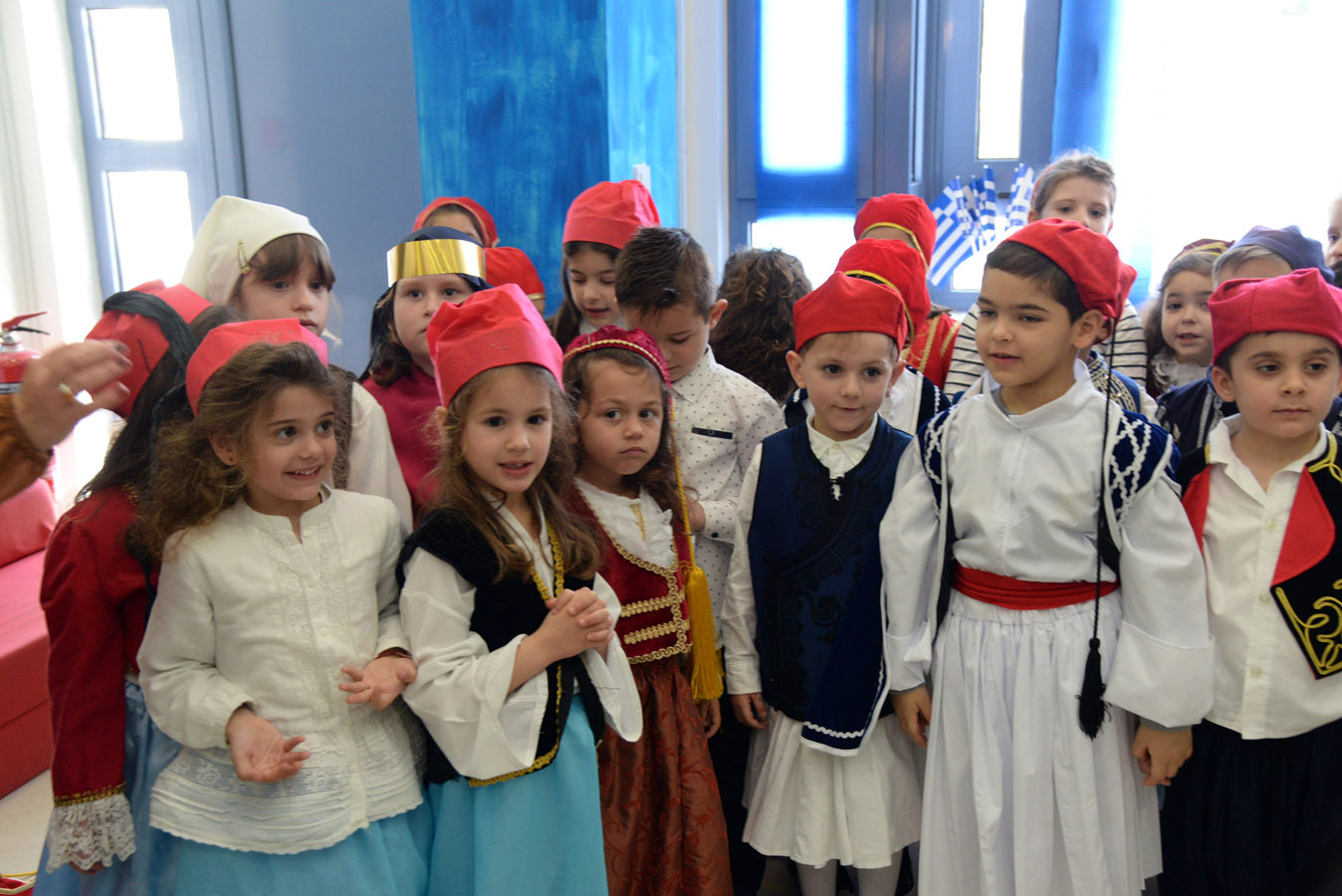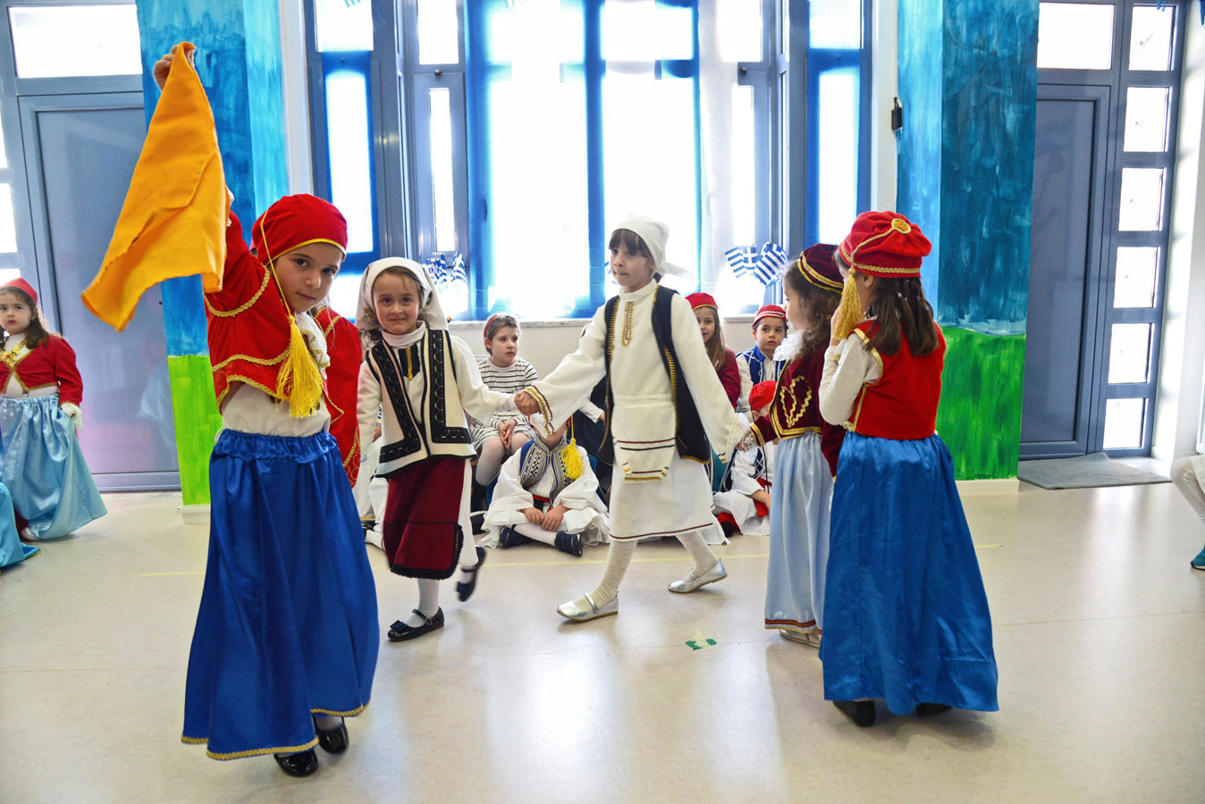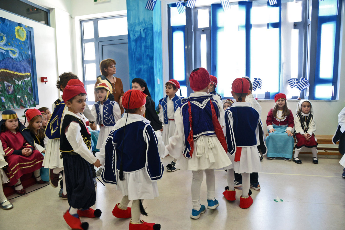 Απαγγέλουμε ποιήματα, λέμε τραγούδια και χορεύουμε ελληνικούς χορούς.