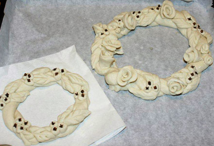 Μόλις ετοιμάσουμε το ζυμαράκι, με τα χέρια μας φτιάχνουμε στεφανάκια με στολίδια επάνω