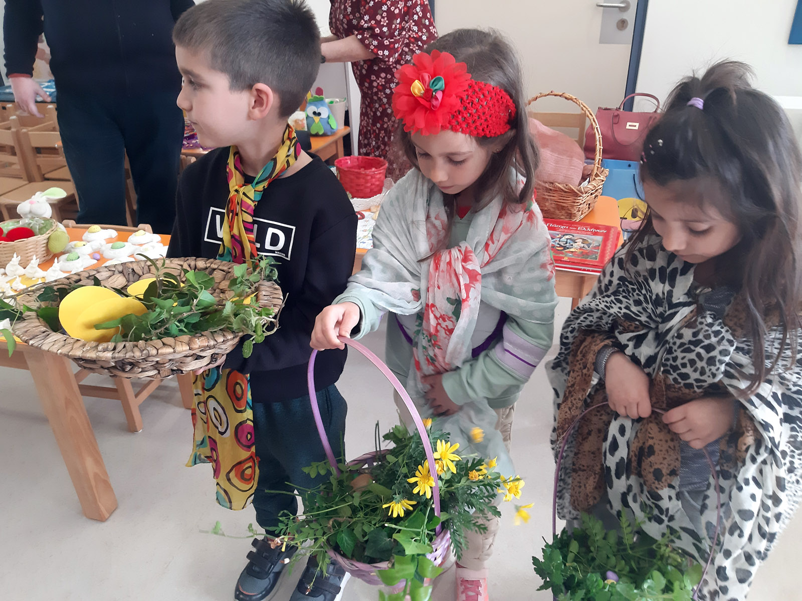 Κρατώντας καλαθάκια με αγριολούλουδα και ομοιώματα του Λαζάρου,