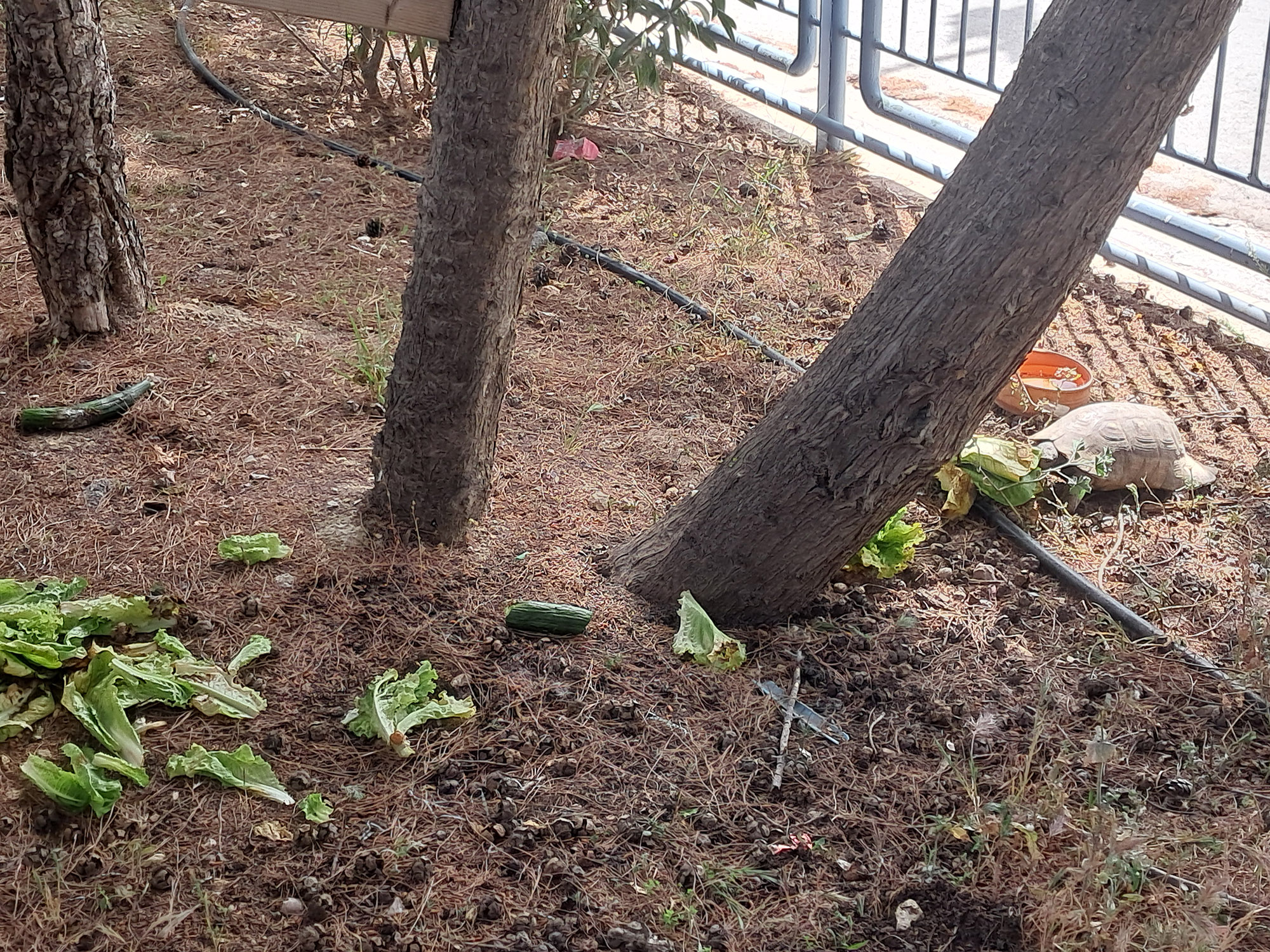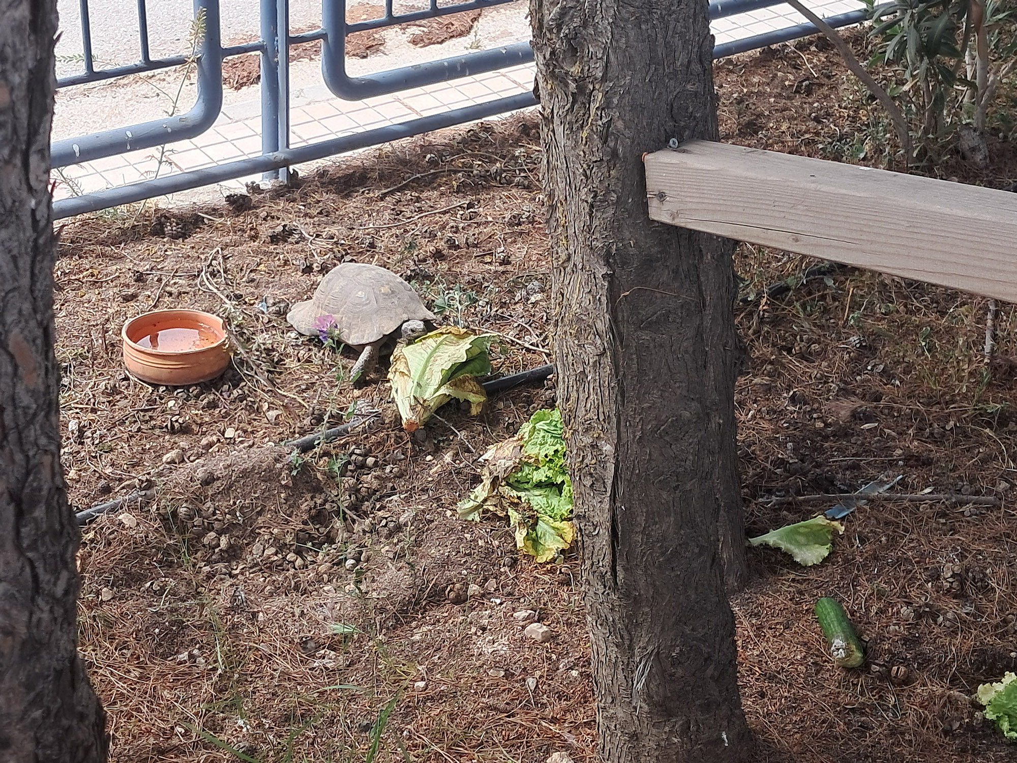 μια μεγάλη χελώνα που τη φροντίζουμε φέρνοντάς της χορταράκια από τον κήπο μας