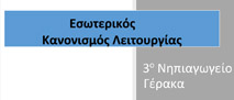 Κανονισμός λειτουργίας ![]() Εσωτερικός Κανονισμός Λειτουργίας 3ου Νηπιαγωγείου Γέρακα Ο Εσωτερικός Κανονισμός Λειτουργίας του Σχολείου επιδιώκει να εξασφαλίσει τις προϋποθέσεις και τις συνθήκες που είναι απαραίτητες για να πραγματοποιείται όσο καλύτερα γίνεται το έργο του σχολείου και να επιτυγχάνονται όσο γίνεται καλύτερα οι στόχοι που θέτουμε κάθε φορά ως σχολική κοινότητα . Δείτε περισσότερα ... - 2025-26 - 2024-25 - 2023-24 - 2022-23 - 2021-22 - 2020-21 ERASMUS+ 2024-2025: ![]() FIRST STEPS STEAM Δείτε περισσότερα ... Δείτε την παρουσίαση ... FIRST STEPS STEAM: Compilation of 50 STEAM activities «Γωνιά της UNESCO»