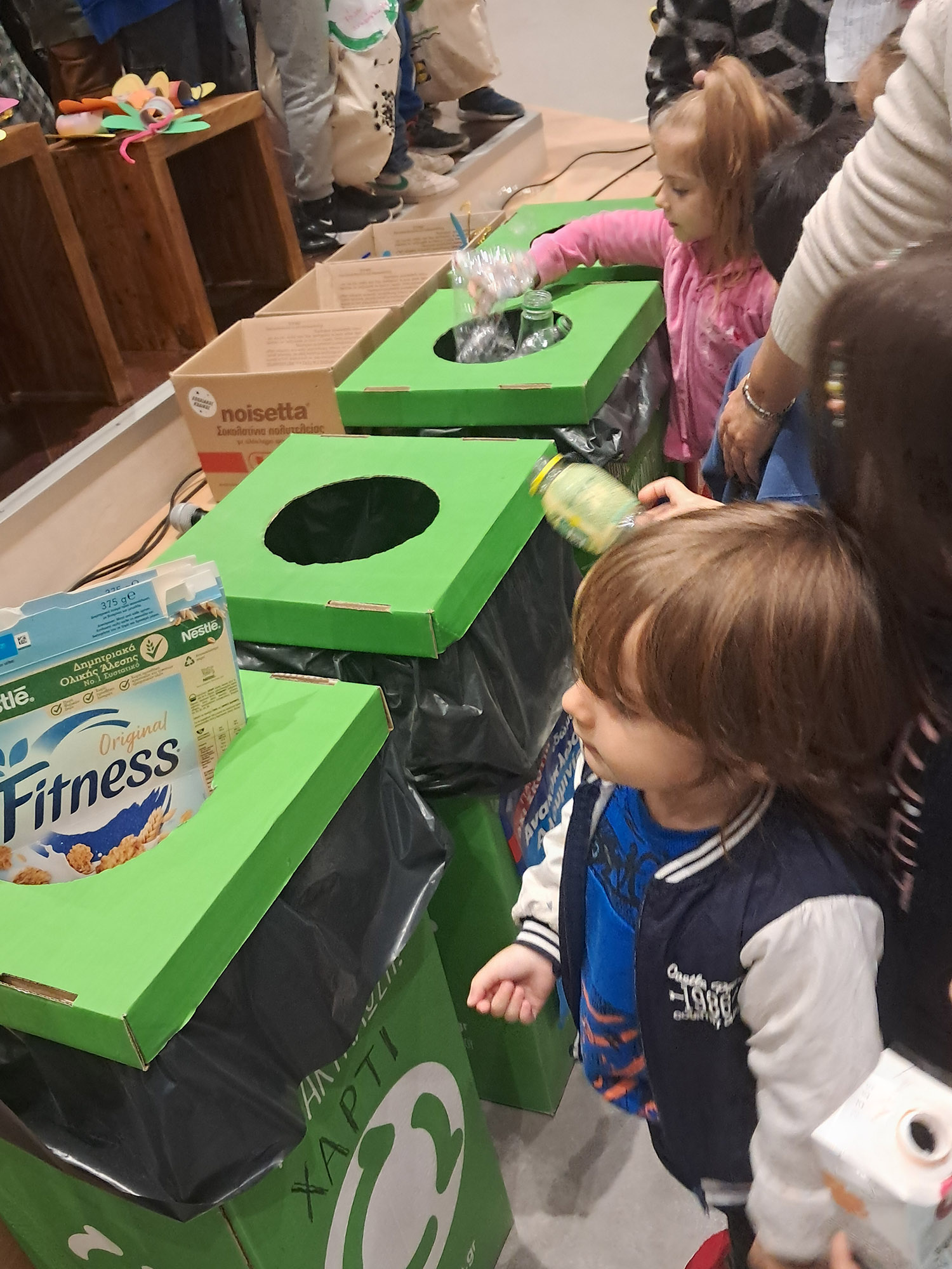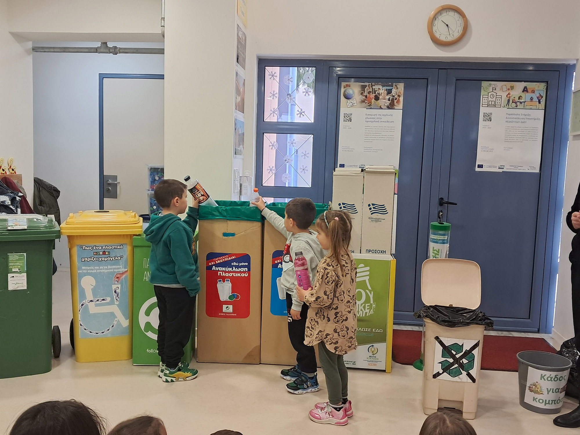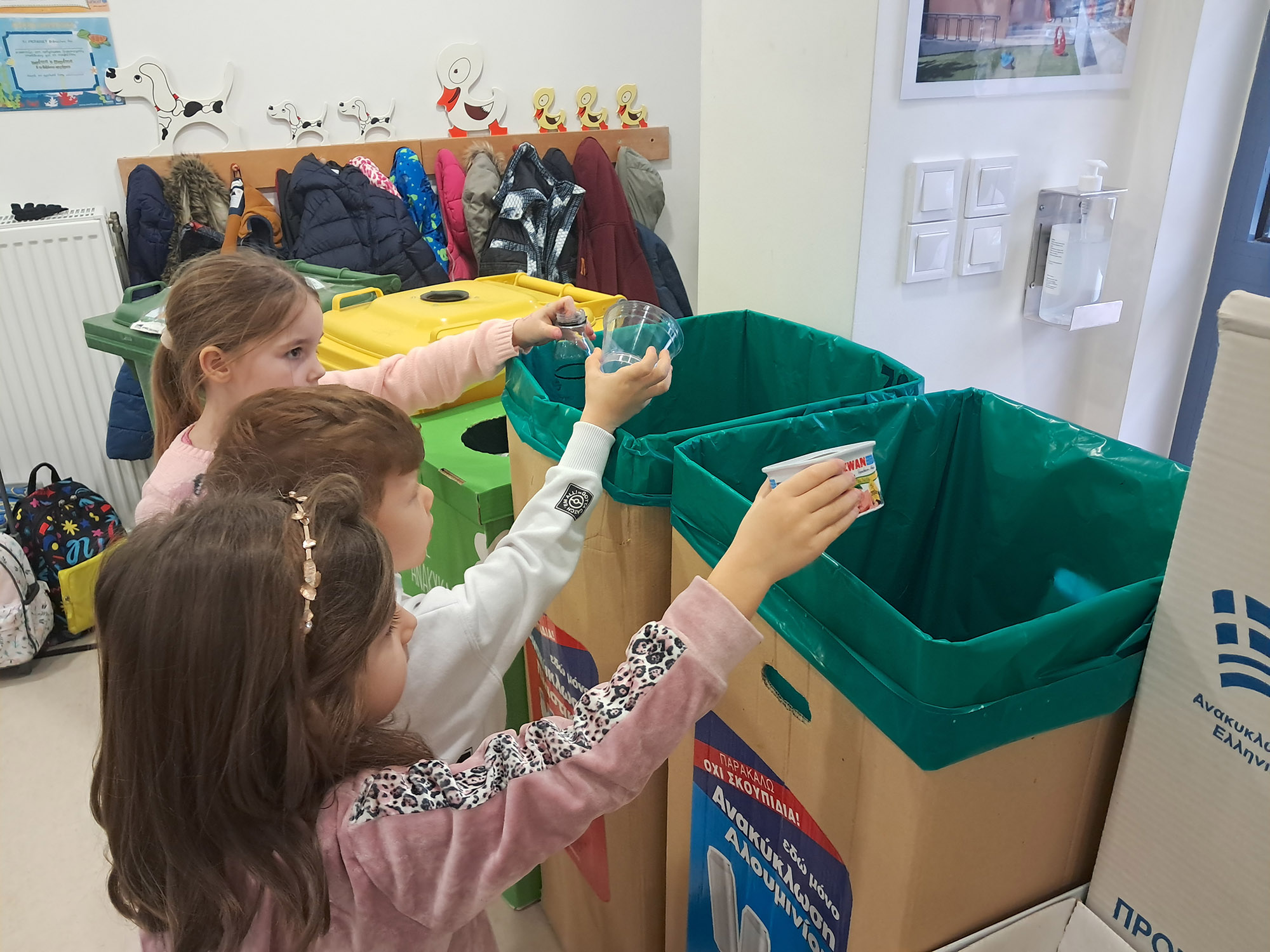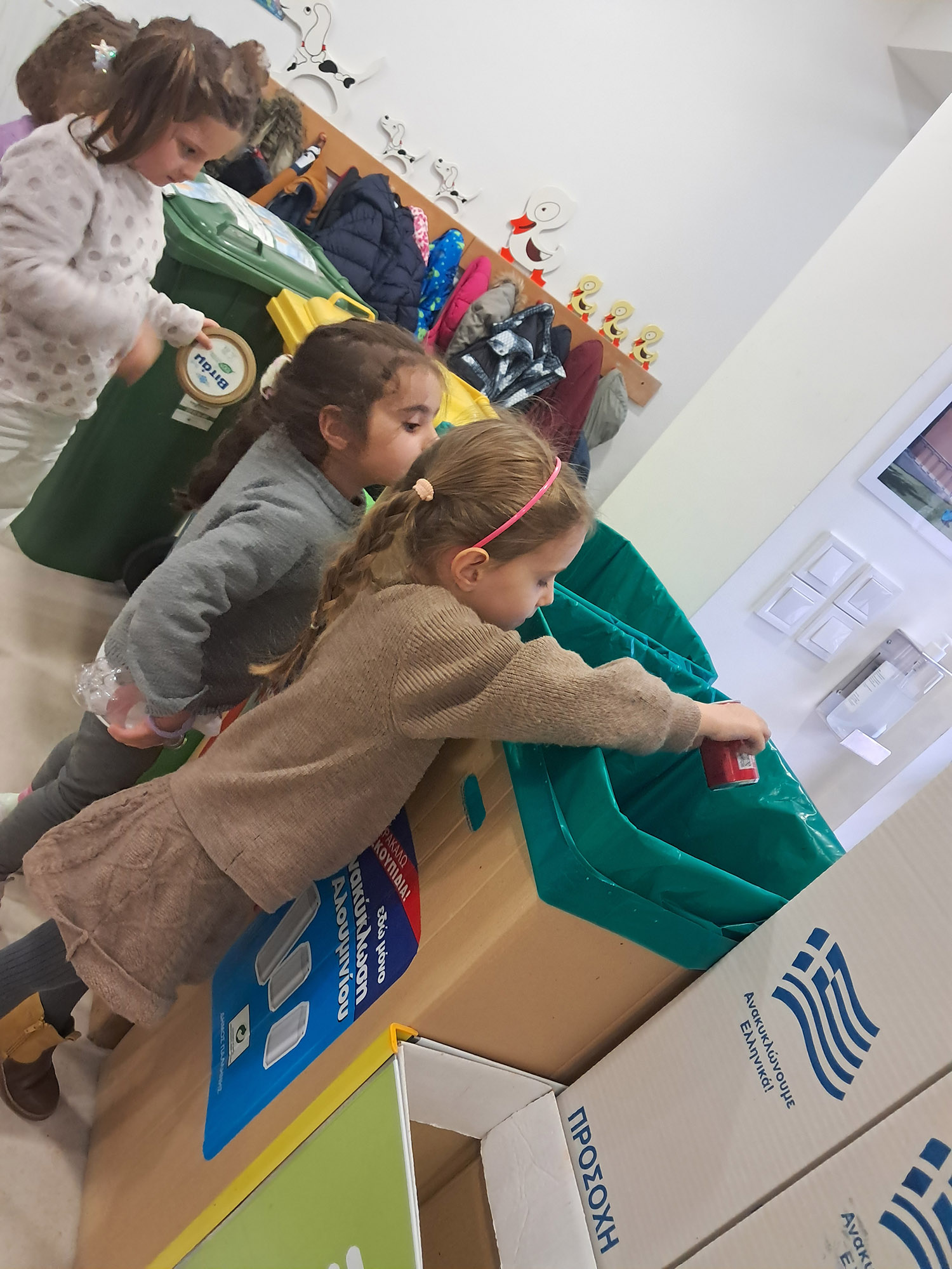 τοποθετώντας τα ανακυκλώσιμα υλικά που είχαν φέρει από το σπίτι τους στους αντίστοιχους κάδους.
