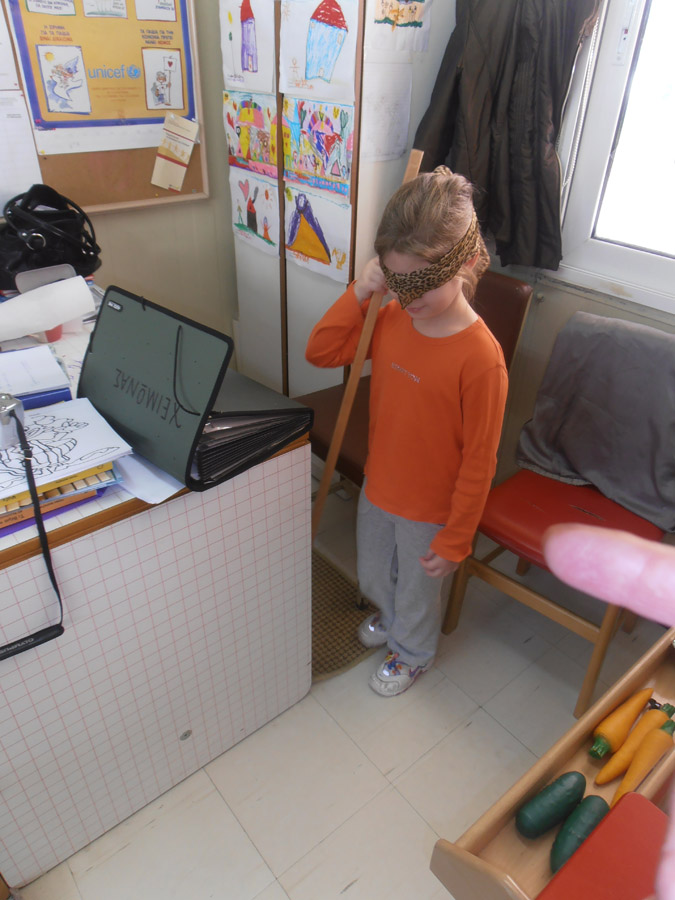 Παίζουμε παιχνίδια (τυφλόμυγα, κουτσό, η μικρή Ελένη) περπατάμε με ξυλόποδαρα στην αυλή μας