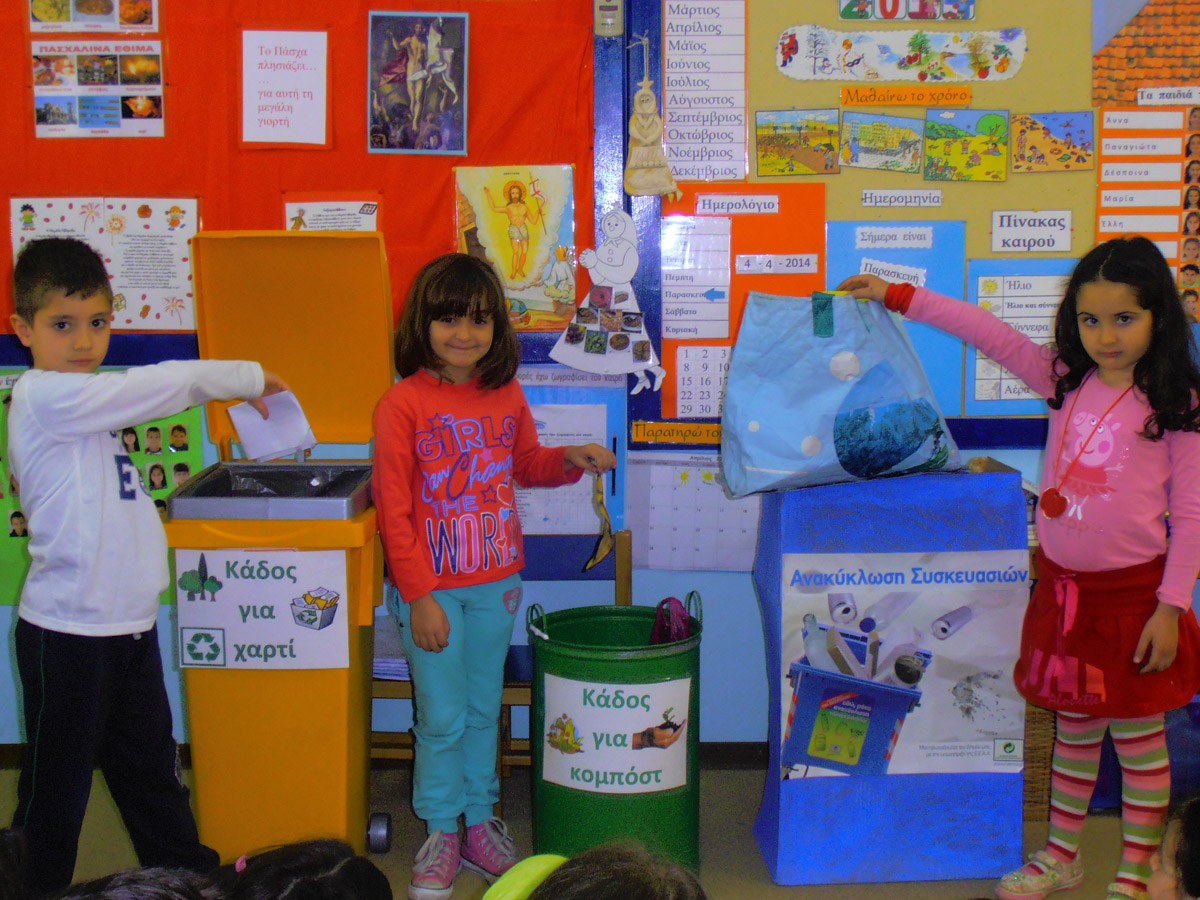 μέσα από Περιβαλλοντικά προγράμματα που στόχο έχουν να βοηθούν τα παιδιά: Να έρθουν σε πρώτη επαφή με τις διαδικασίες της ανακύκλωσης και επαναχρησιμοποίησης υλικών