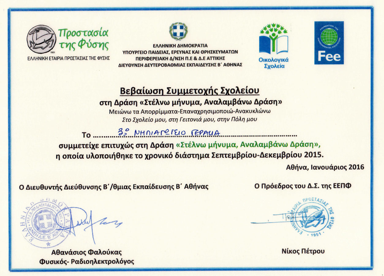 Το 3ο Νηπιαγωγείο Γέρακα στο τέλος του τριμήνου βραβεύτηκε από την