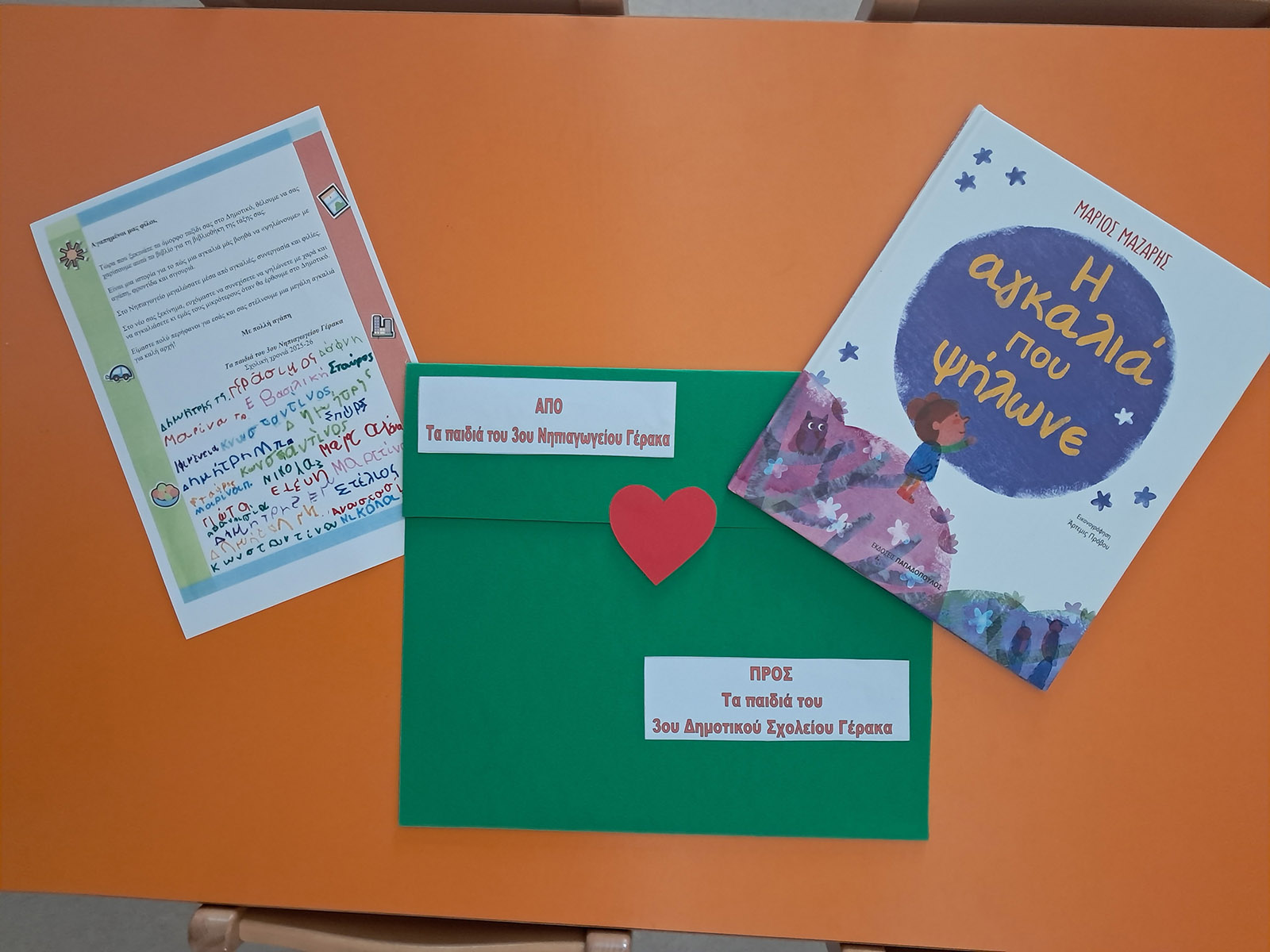 το βιβλίο του Μ. Μάζαρη «Η αγκαλιά που ψήλωνε», συνοδευόμενο από ένα γράμμα